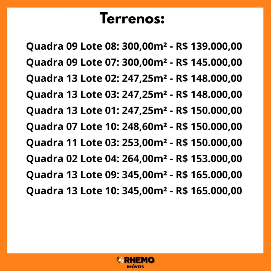 - Quadra 13 Lote 03: 247,25m² - R$ 148.000,00